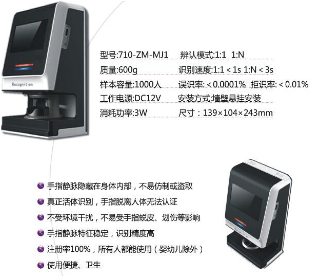 此項(xiàng)技術(shù)利用近紅外線穿透手指后所得的靜脈紋路影像來(lái)進(jìn)行個(gè)人識(shí)別,是具有高精度,高速度的世界上最尖端的生物識(shí)別技術(shù).